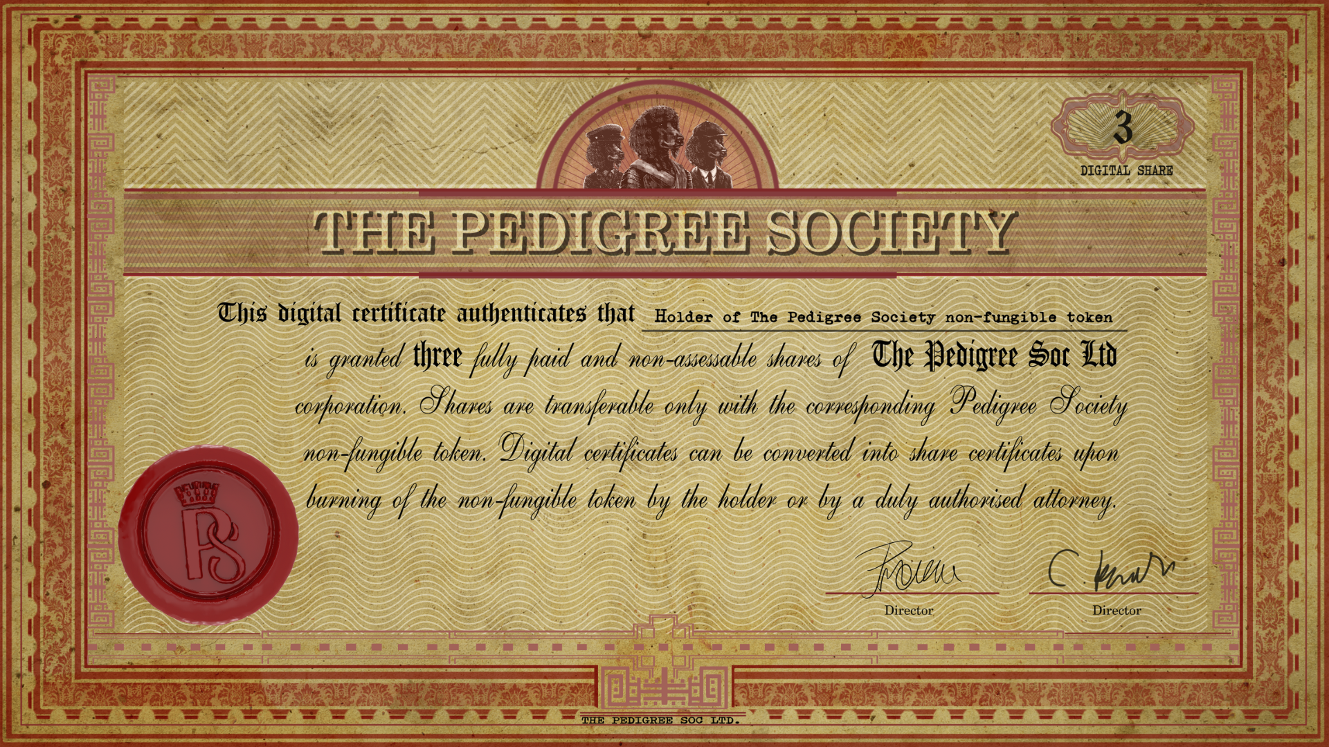 <figure><img src="https://3490090517-files.gitbook.io/~/files/v0/b/gitbook-x-prod.appspot.com/o/spaces%2FqYrtVPVy7ZBbeR81INNR%2Fuploads%2F5Dgwbxf617TBsT8Jix1C%2FPedigree%20Share.png?alt=media&#x26;token=6df45a53-f310-400c-bb69-b9e0ff2275ab" alt=""><figcaption><p>Digital Share Certificate that will sit behind your primary art piece.</p></figcaption></figure>